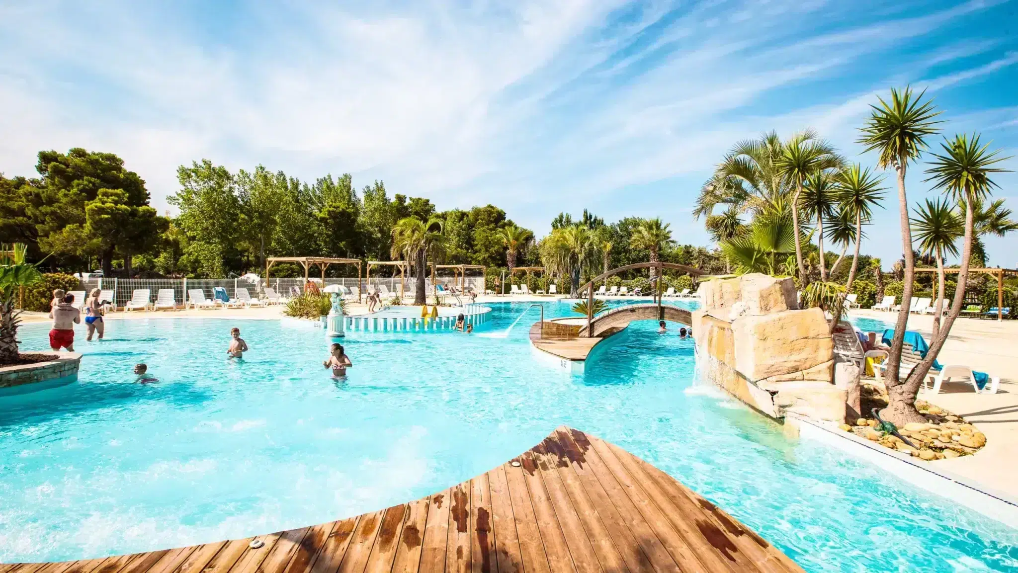Vous partez en vacances dans l’Hérault et souhaitez trouver un camping Marseillan Plage avec piscine ? Découvrez notre parc aquatique à 20 min à peine de Marseillan. Son parc aquatique de 3 000 m² vous offre deux piscines chauffées, l’une dédié au sport, l’autre à la détente, ainsi qu’un espace réservé aux petits, avec une pataugeoire et son mini toboggan. Accessible tous les jours entre 9 h 30 et 19 h 30, relaxez-vous à n’importe quel moment pendant votre séjour dans un cadre agréable. Palmiers, bassins aux eaux turquoises, îlots accessibles d’un petit pont pour se ressourcer au calme : le décor invite à la sérénité et au farniente.