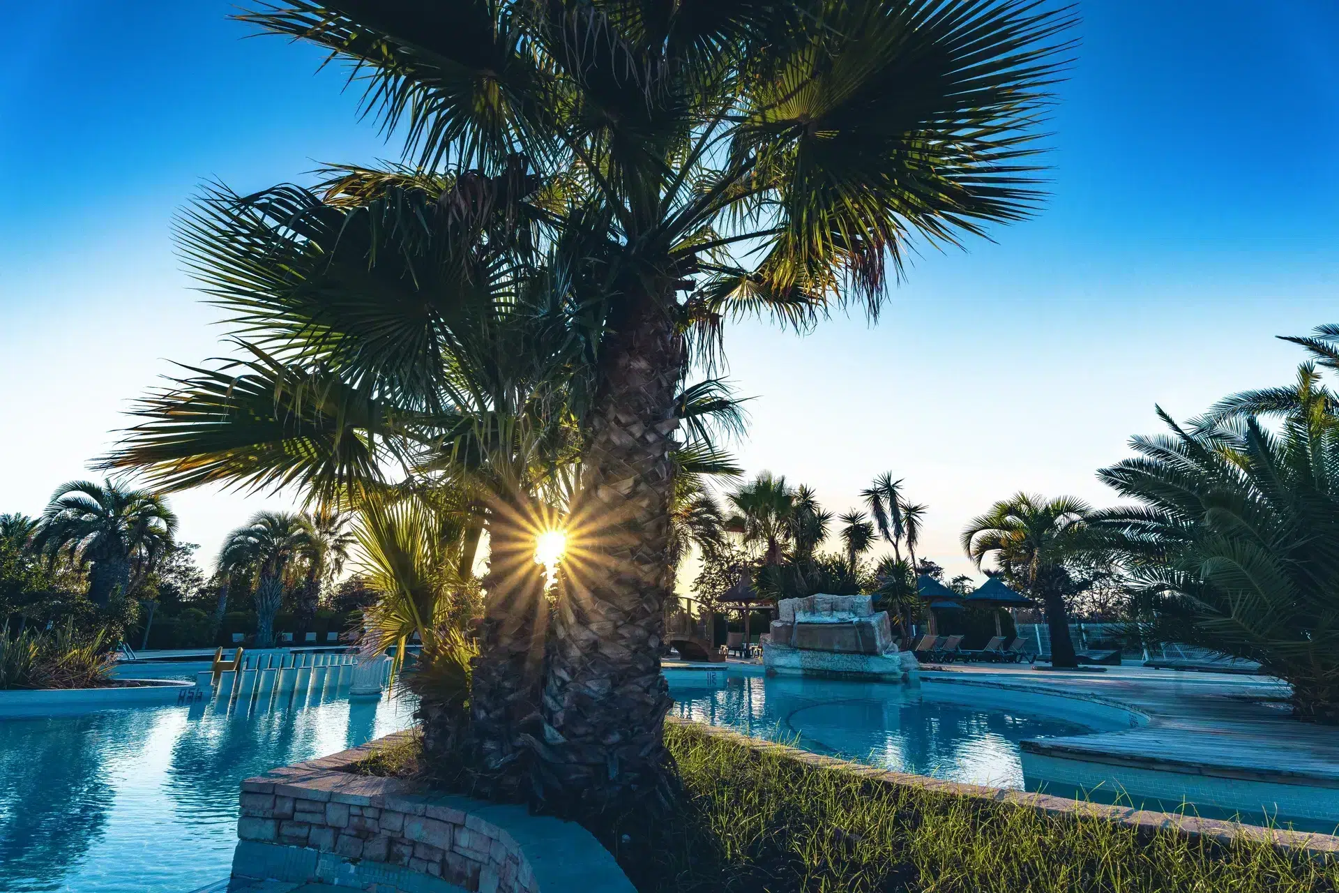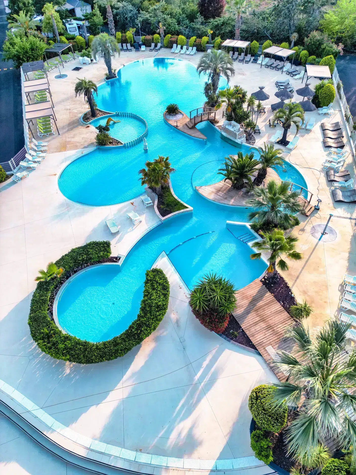 Mis en valeur comme un espace naturel, le bassin de la piscine extérieure est agrémenté de pontons et d’îlots de détente en bois. Son pourtour offre une vaste plage ombragée au milieu des palmiers, de parasols paillotes et de pergolas, et équipée de nombreux transats. Un espace pataugeoire avec petit toboggan accueille les jeux des plus petits, facilement accessible depuis votre camping-car placé sur votre emplacement de camping ou bien de votre mobil-home.